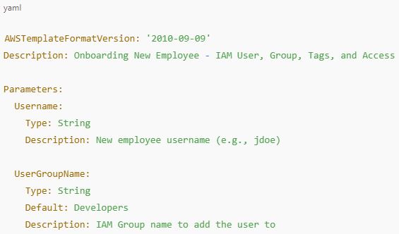 Use CloudFormation YAML template to automate the onboarding process for a new employee: