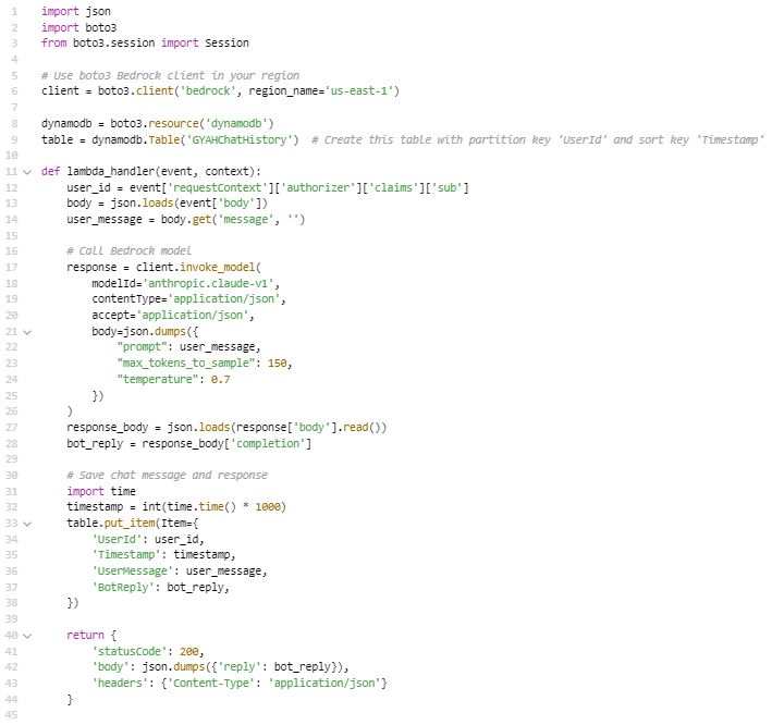 - In Lambda, call Bedrock foundation models (e.g., Anthropic Claude) to get chatbot reply.
